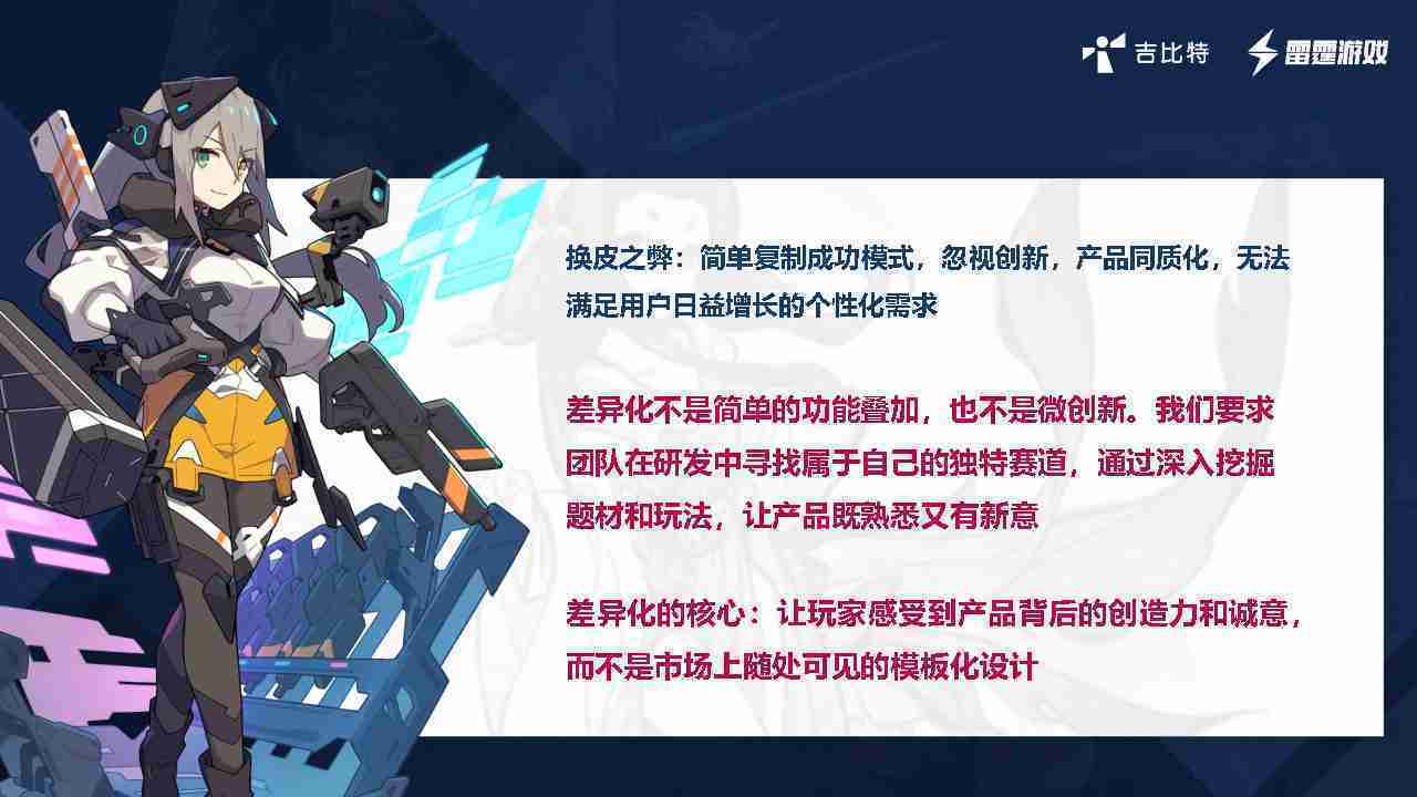 在我们内部是这么定义差异化的。。。。首先,,,,差异化不是简单的功能叠加,,更不是换皮。。只是换皮,,产品无法提供有效的市场价值。。。。内部经常说差异化的产品不是为了迎合市场,,,而是找到一个自己独特的表达方式,,,,在研发中找到属于自己的细分赛道和独特赛道,,前提是需要对这个题材有足够的深入、、、、挖掘,,,对玩法有足够深入的理解,,,让产品看起来既熟悉又有新意。。。