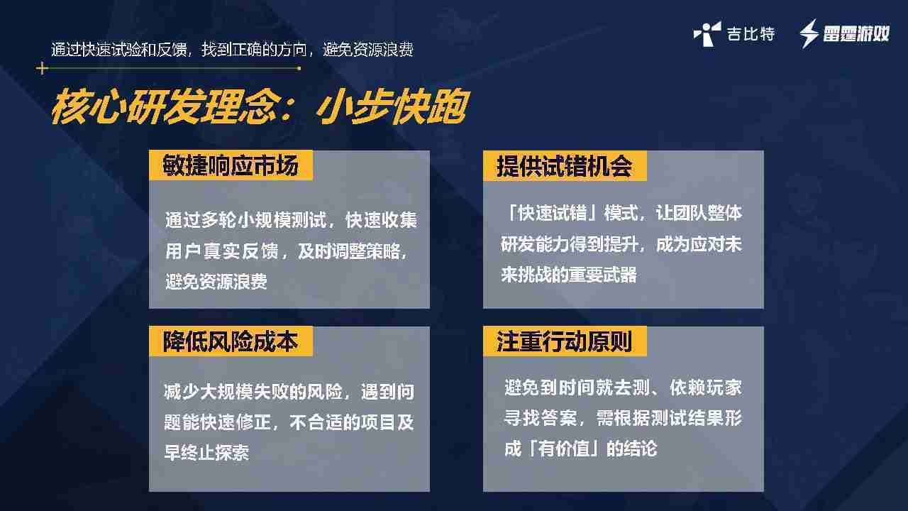 小步快跑不是找答案,,而是验证答案。。。。我们之前有项目是这样的,,有些制作人会有几个方向觉得都可以做,,,,但是不确定做哪一个,,会选择几个都做,,,做完拿到市场跑,,跑出哪一个更好,,,基于这个再做后续的研发和拓展。。但这种情况最容易出现一个问题,,,可能被玩家裹胁,,玩家说这个点不错、、、、那个点不错,,到底听还是不听,,,,不听感觉是无视玩家的反馈,,,听的话,,,可能自己没想清楚导致研发思路发生偏颇。。。所以针对这一点后面自己复盘整理,,发现制作人自己心里要有数,,要做自己觉得好玩的,,而且明确知道这个东西是你想做的,,,,然后拿到市场验证这个答案是不是对的,,,而不是拿一堆答案找哪一个答案更好。。